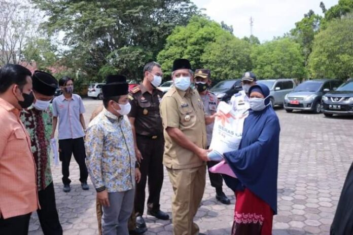 Siak (Gomediaku.com) – Pemkab Siak menyalurkan bantuan sosial untuk masyarakat yang terdampak Pemberlakuan Pembatasan Kegiatan Masyarakat (PPKM) di halaman Mess Pemda, jalan Raja Kecik Siak Sri Indrapura, Senin (26/7). Bantuan diberikan langsung secara simbolis oleh Bupati Siak Alfedri kepada perwakilan Keluarga Penerima Manfaat (KPM).