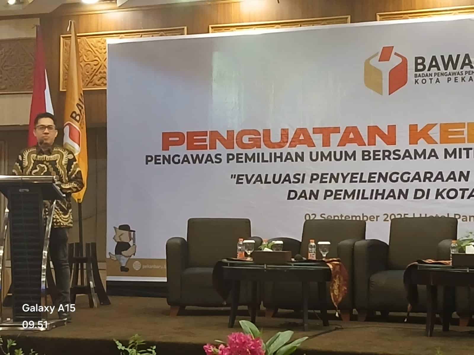 PEKANBARU, Gomediaku.com — Badan Pengawas Pemilihan Umum (Bawaslu) Kota Pekanbaru mengadakan kegiatan penguatan kelembagaan pengawas pemilihan umum bersama mitra kerja Bawaslu, bertempat di Hotel Pangeran jalan Jenderal Sudirman, Pekanbaru, selasa (2/9/25).