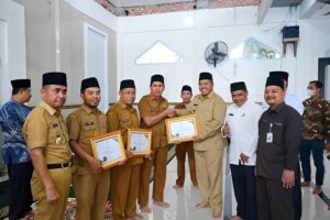 Setelah menyerahkan secara simbolis pendistribusian zakat tahap I tahun 2023 pola konsumtif kepada perwakilan mustahik di Kecamatan Tualang, Bupati Alfedri memberikan penghargaan Baznas Award kepada UPZ terbaik se Kecamatan Tualang.(mc-kab-siak/riki,deo)***