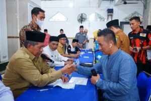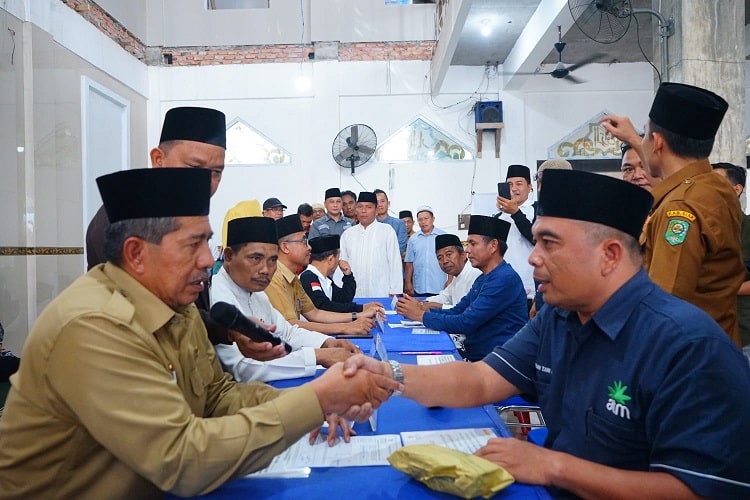 TUALANG- Badan Amil Zakat Nasional (BAZNAS) Kabupaten Siak mengelar Gerakan Masyarakat (Gemar) Siak Berzakat ke- 10 tahun 2023 dan pendistribusian zakat tahap I, yang dilaksanakan di Masjid Nurul Hidayah Kelurahan Perawang, Kecamatan Tualang, Senin (3/4/2023).