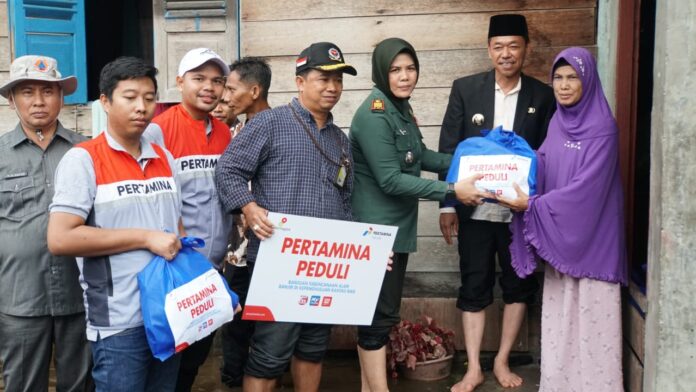 ROKAN HILIR (gomediaku.com) – Bencana banjir melanda sejumlah kawasan di Provinsi Riau, salah satunya di Kepenghuluan Rantau Bais, Kabupaten Rokan Hilir. Pertamina Hulu Energi (PHE) Siak mengambil langkah cepat untuk memberikan bantuan bahan pokok di sekitar wilayah operasional. Sebanyak 150 paket bahan pokok yang terdiri dari 7,5 kwintal beras, mie instan, gula dan sarden siap masak disalurkan PHE Siak bersama Bupati Rokan Hilir Afrizal Sintong kepada masyarakat Rantau Bais, Kamis (04/01/2024).