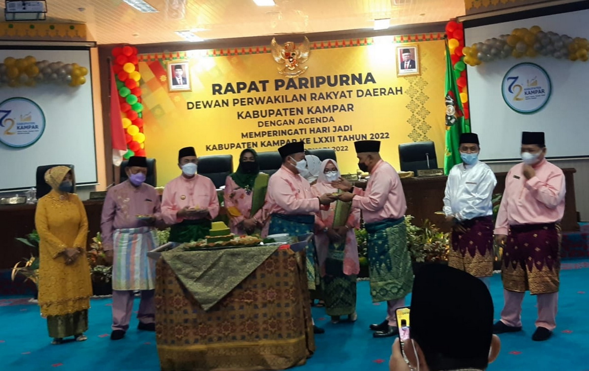 Dewan Perwakilan Rakyat (DPRD) Kabupaten Kampar melaksanakan Rapat Paripurna Hari Jadi Kabupaten Kampar ke-72, Minggu (6/2/2022) di Gedung DPRD Kabupaten Kampar. Pada kesempatan tersebut, lembaga legislatif Kampar ini siap melakukan pengawalan program Pemkab Kampar sesuai dengan tema HUT tahun ini “Vaksin Tuntas, Kampar Sehat, Ekonomi Bangkit”.