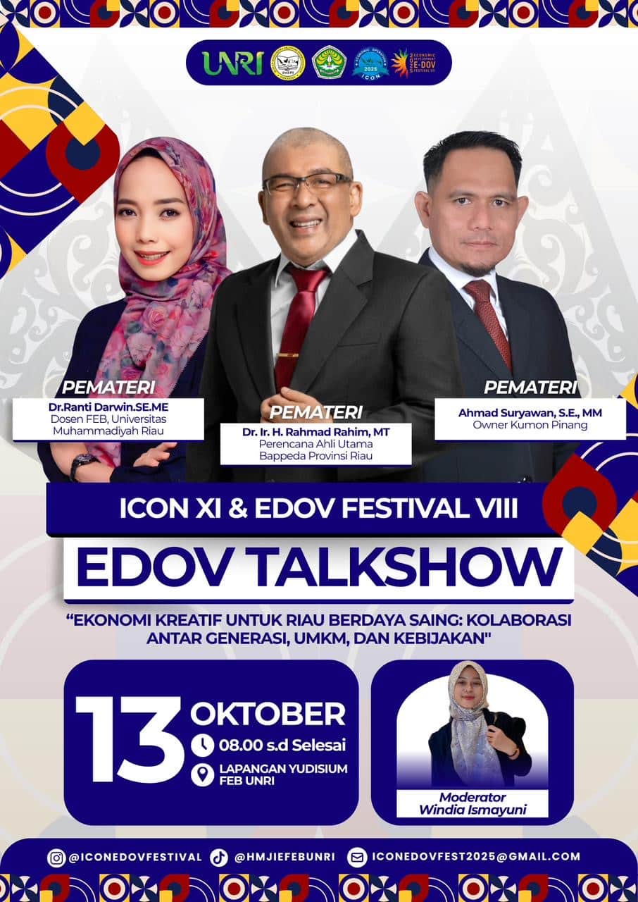 Pekanbaru, Gomediaku.com — Himpunan Mahasiswa Jurusan Ilmu Ekonomi Fakultas Ekonomi dan Bisnis Universitas Riau (FEB UNRI) kembali menggelar kegiatan inspiratif bertajuk EDOV Talkshowsebagai rangkaian dari ICON XI & EDOV Festival VIII. Acara ini akan diselenggarakan pada 13 Oktober 2025 mulai pukul 08.00 WIB hingga selesai di Lapangan Yudisium FEB UNRI.