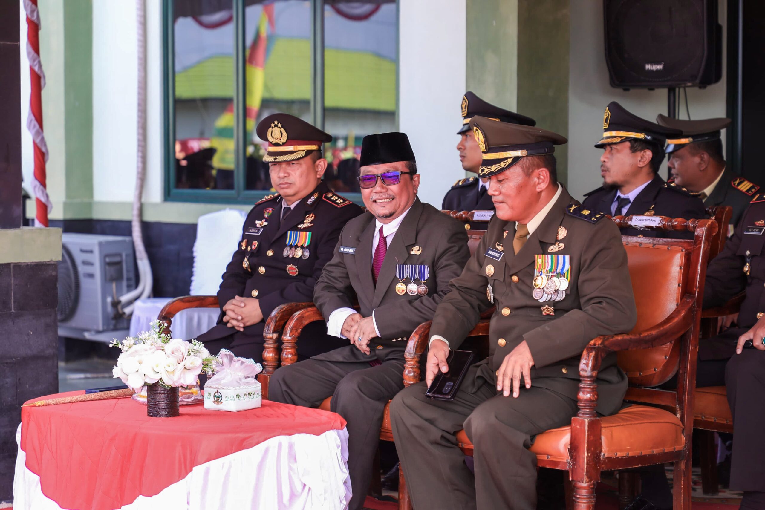 Bertindak sebagai Inspektur Upacara Kepala Staff Kodim (Kasdim) 0322/Siak Mayor Inf Suratno, dan dihadiri oleh Kapolres Siak AKBP Asep Sujarwadi, unsur Forkopimda Kabupaten Siak lainnya, unsur Vertikal, para Asisten serta Kepala OPD dilingkungan Pemerintah Kabupaten Siak.