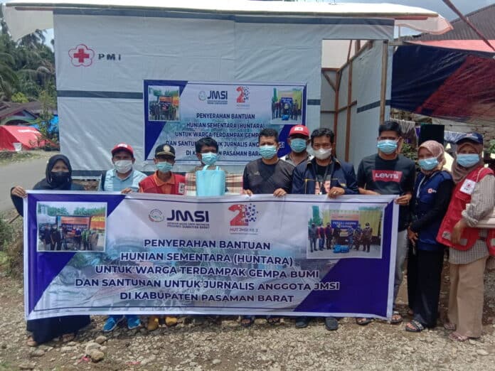 PASAMAN BARAT – Jaringan Media Siber Indonesia (JMSI) menyerahkan donasi untuk pembangunan empat unit hunian sementara (Huntara) bagi korban gempa 6,2 SR di Nagari Kajai, Kecamatan Talamau, Ahad (13/03/2022).