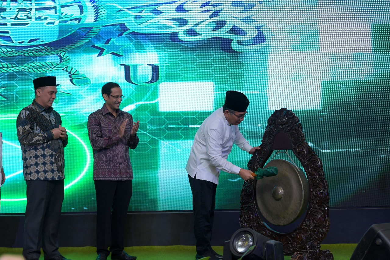 Simposium Nasional Digitalisasi Perguruan Tinggi Nahdlatul Ulama dibuka oleh Menteri Pendidikan, Kebudayaan, Riset, dan Teknologi (Mendikbudristek), Nadiem Anwar Makarim, Wakil Menteri Agama RI, Saiful Rahmat Dasuki, dan Ketua Umum Pengurus Besar Nahdlatul Ulama (PBNU), KH. Yahya Cholil Staquf.