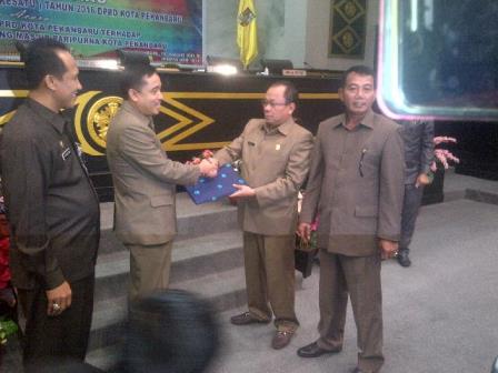 Ketua DPRD Kota Pekanbaru Sahril.SH menyerahkan Naskah Perda Masjid-Paripurna kepada Setko Pekanbaru Syukri Harto. (rsc)
