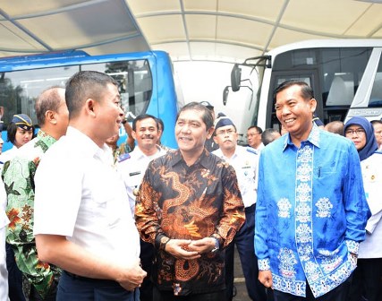Walikota Pekanbaru Firdaus menerima bantuan bus angkutan yang diserahkan langsung oleh Sekjen Perhubungan Kementerian Perhubungan RI Ir. Sugihardjo, M.Si di Kementrian Perhubungan RI. (gsc)