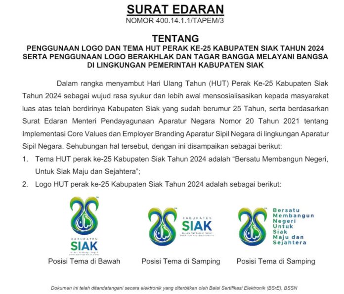 Khusus untuk instansi/ Organisasi Perangkat Daerah (OPD) di Lingkungan Pemerintah Daerah Kabupaten Siak serta penghulu kampung se-Kabupaten Siak agar mencantumkan logo dan tema HUT perak ke-25 Kabupaten Siak Tahun 2024 pada kop surat dinas tahun 2024.