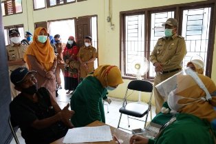 Alfedri yang didampingi Kepala Dinas Kesehatan kabupaten Siak Tony Chandra, tiba di lokasi pertama tempat pelaksanaan vaksinasi, dan menyapa satu persatu warga yang hendak divaksin.