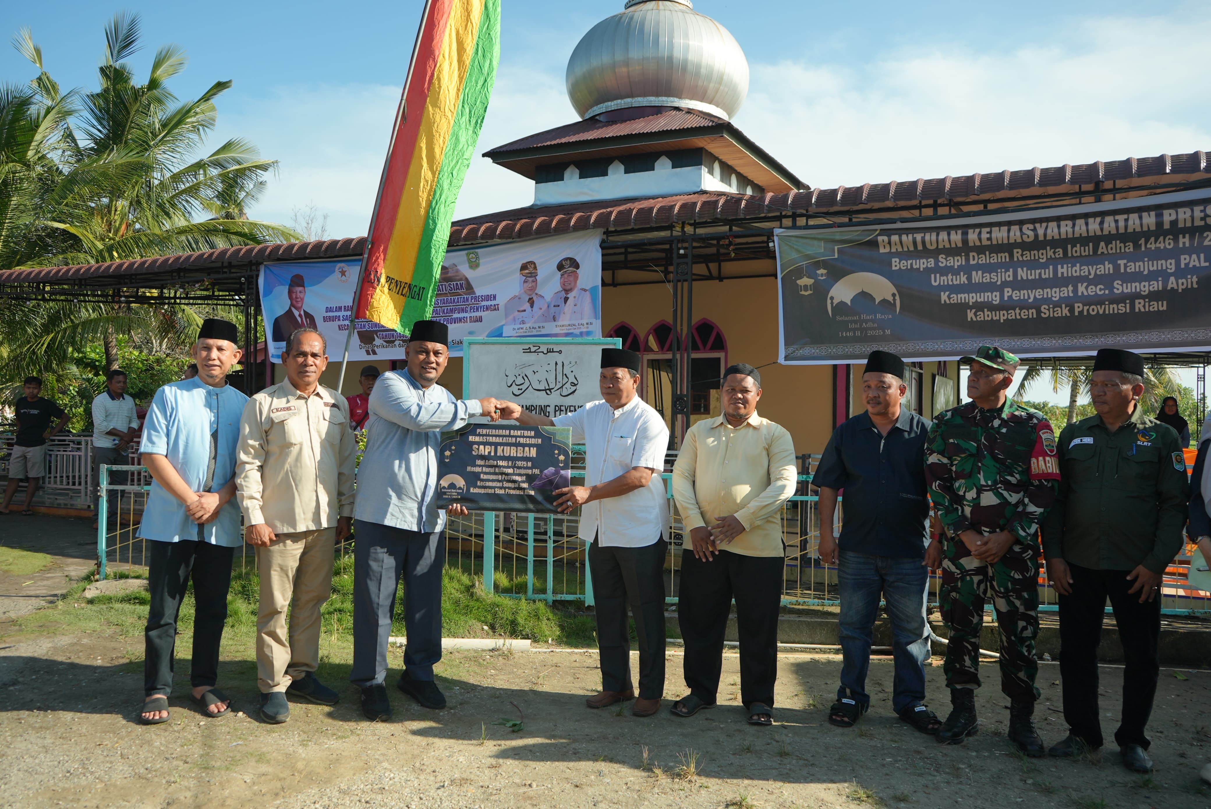 Sungai Apit, Gomediaku.com — Wakil Bupati Siak Syamsurizal menyerahkan 1 ekor sapi kurban bantuan Presiden Prabowo untuk masyarakat Kampung Penyengat Dusun Tanjung Pal Kecamatan Sungai Apit, Kabupaten Siak.