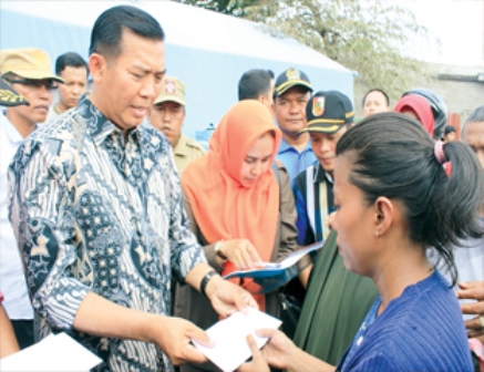 Walikota Pekanbaru, Firdaus, menyalami pada korban kebakaran warga Jalan Karet, Pekanbaru, Sabtu (13/2/2016). Musibah pada Jumat (12/2/2016) pukul 13.15 WIB tersebut menghanguskan 24 rumah dan hingga kini masih dalam penyelidikan polisi.